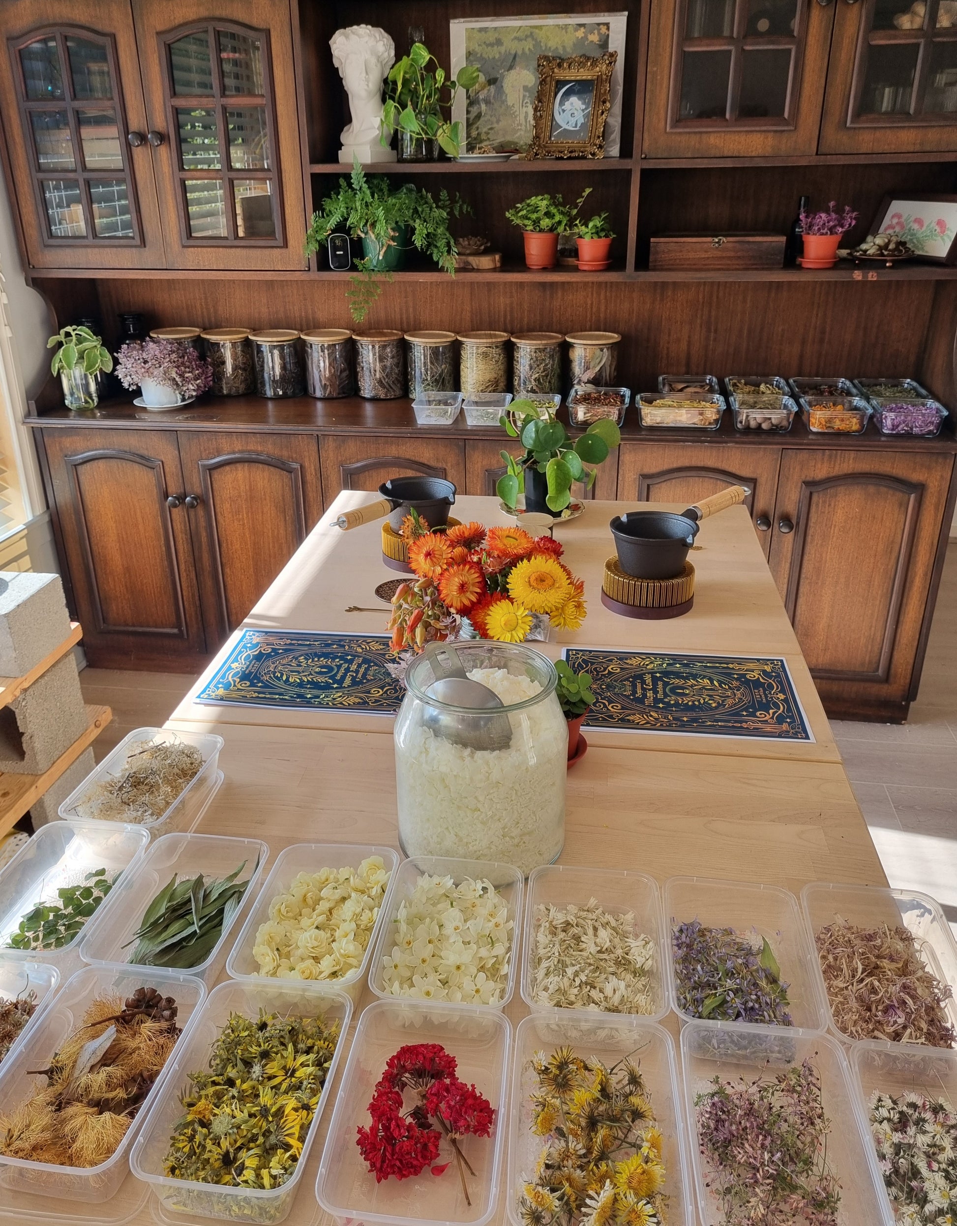 All herbs and plants are carefully selected: homegrown by the teacher, respectfully gathered from nature, or sourced from local florists.
